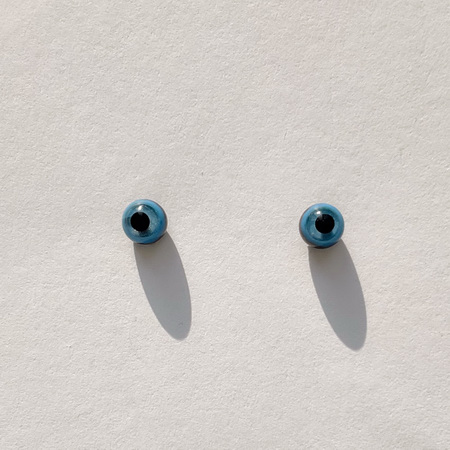 A pair of "Blueberry Jelly" glass eyes, 4.5 mm in diameter. These bright eyes have a cheerful look. A metal loop on the back for hanging.