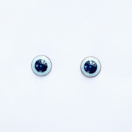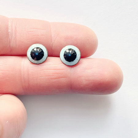 A pair of enamel eyes, "Candy with Grape Jam," 10 mm in diameter. The eyes have a unique anime-inspired look, with a blue bubble in the center of the pupil. The button eyes are made using the hot enamel technique - colored glass on a copper base. A metal loop for sewing on is on the back.