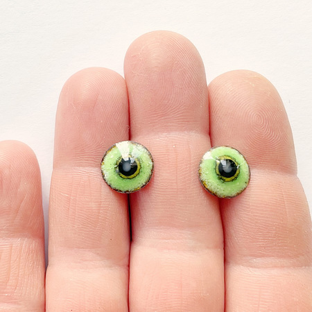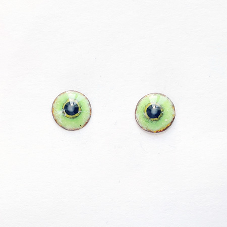 A pair of enamel "Chocolate Apple" eyes, 11 mm in diameter. The eyes have a unique anime-inspired look, with a white bubble in the center of the pupil. The button eyes are made using the hot enamel technique - colored glass on a copper base. A metal loop for sewing on is on the back.