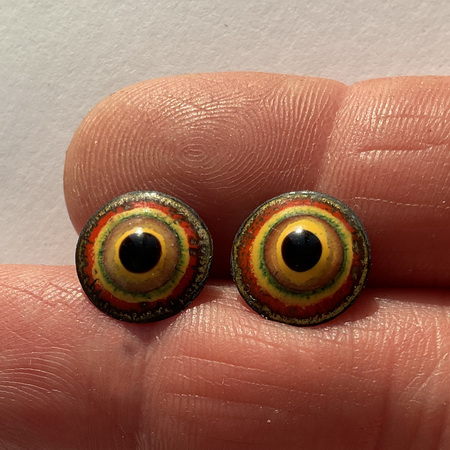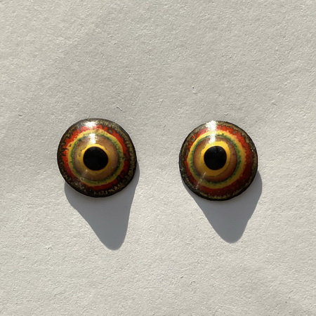 A pair of enamel eyes, "Chocolate-covered roasted nuts" 11,5 mm in diameter. A watchful gaze. The button eyes are made using the hot enamel technique - colored glass on a copper base. A metal loop for sewing on the back.