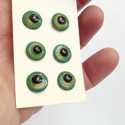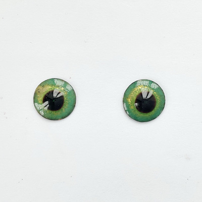 A pair of enamel eyes, "Choux pastry with Apple Cream and Gold Leaf," 11 mm in diameter. The eyes have a captivating look. The button eyes are made using the hot enamel technique - colored glass on a copper base. A metal loop for sewing on is on the back.