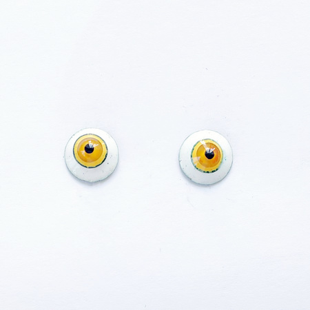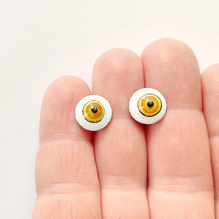 A pair of enamel "Eggnog with grated chocolate" eyes, 11 mm in diameter. The eyes have a pleading look. The button eyes are made using the hot enamel technique - colored glass on a copper base. On the back is a metal loop for sewing on.