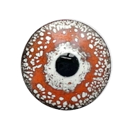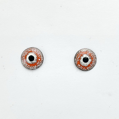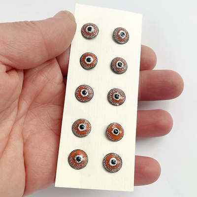 A pair of enamel eyes, "Mushroom Cookie with Cranberry Cream and Sugar Drops," 10 mm in diameter. The eyes have an alluring look. The button eyes are made using the hot enamel technique - colored glass on a copper base. A metal loop for sewing on is on the back.