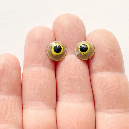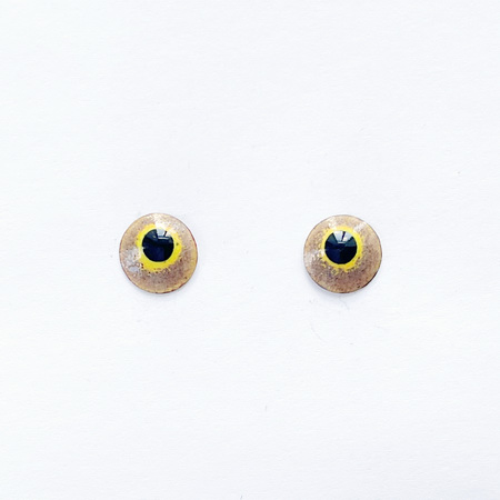 A pair of enamel eyes, "Honey Roll with Nuts," 10 mm in diameter. The eyes have a hungry look. The button eyes are made using the hot enamel technique - colored glass on a copper base. A metal loop for sewing on is on the back.