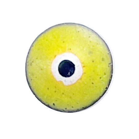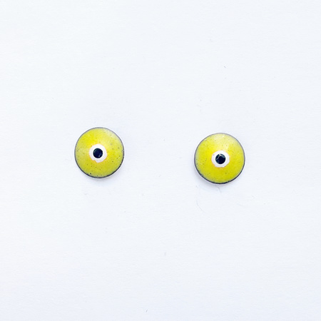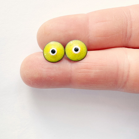 A pair of enamel eyes, "Lemon Ice Cream in a Chocolate Cup," 10 mm in diameter. The eyes have an admiring look. The button eyes are made using the hot enamel technique - colored glass on a copper base. A metal loop for sewing on is on the back.