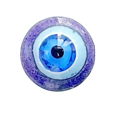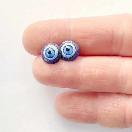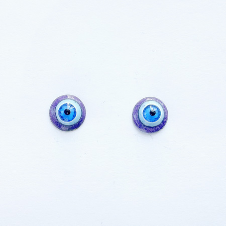 A pair of enamel eyes, "Plum Cake with Whipped Cream and Jelly," 10 mm in diameter. The eyes have a surprised look. The button eyes are made using the hot enamel technique - colored glass on a copper base. A metal loop for sewing on is on the back.
