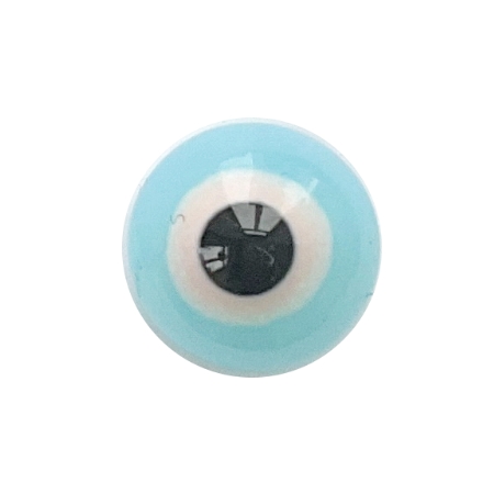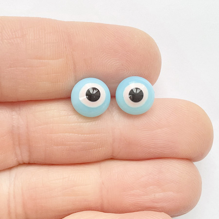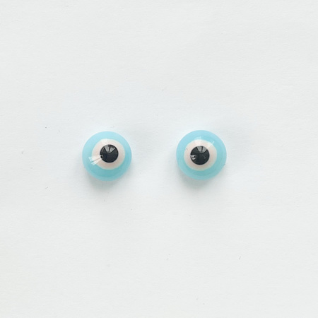 A pair of glass eyes, "Lychee and Strawberry Mochi," 9 mm in diameter. The eyes have a delicate expression. A metal loop on the back for hanging.