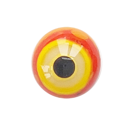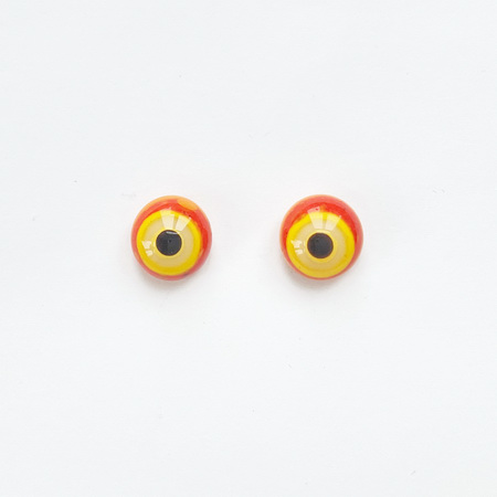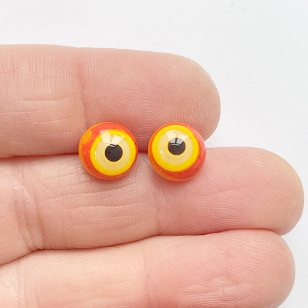 A pair of "Orange Curd" glass eyes, 10 mm in diameter. A bright, alluring gaze. A metal loop on the back for hanging.