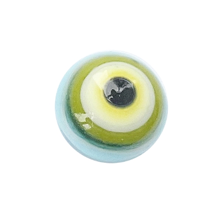 A pair of glass eyes, "Pistachio Pudding with Pineapple and Marshmallow," 9.5 mm in diameter. A naive look. A metal loop on the back for hanging.