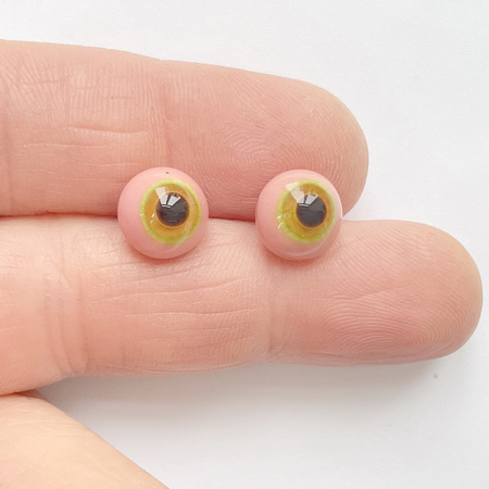 A pair of glass eyes, "Strawberry cake with mint Sauce," 9.5 mm in diameter. The eyes feature a vibrant expression. A metal loop on the back for hanging.